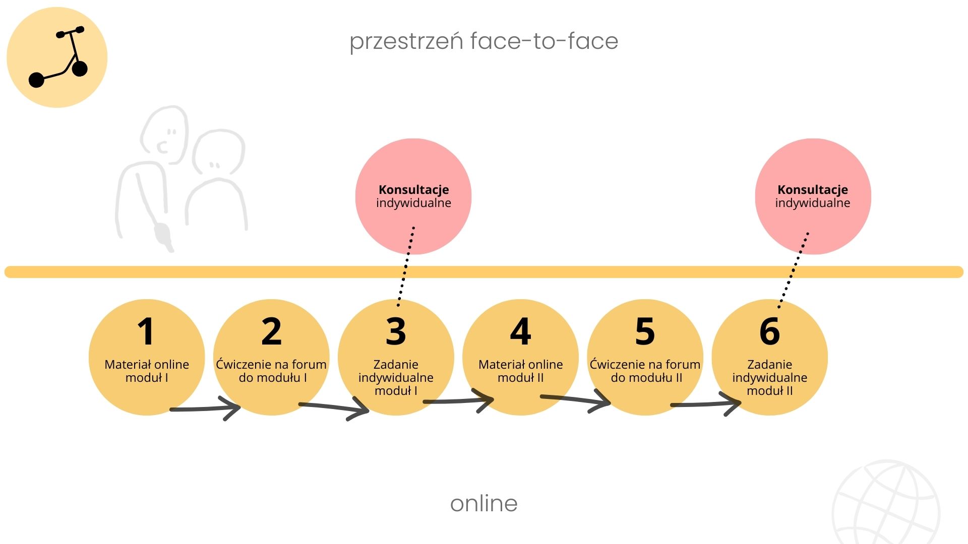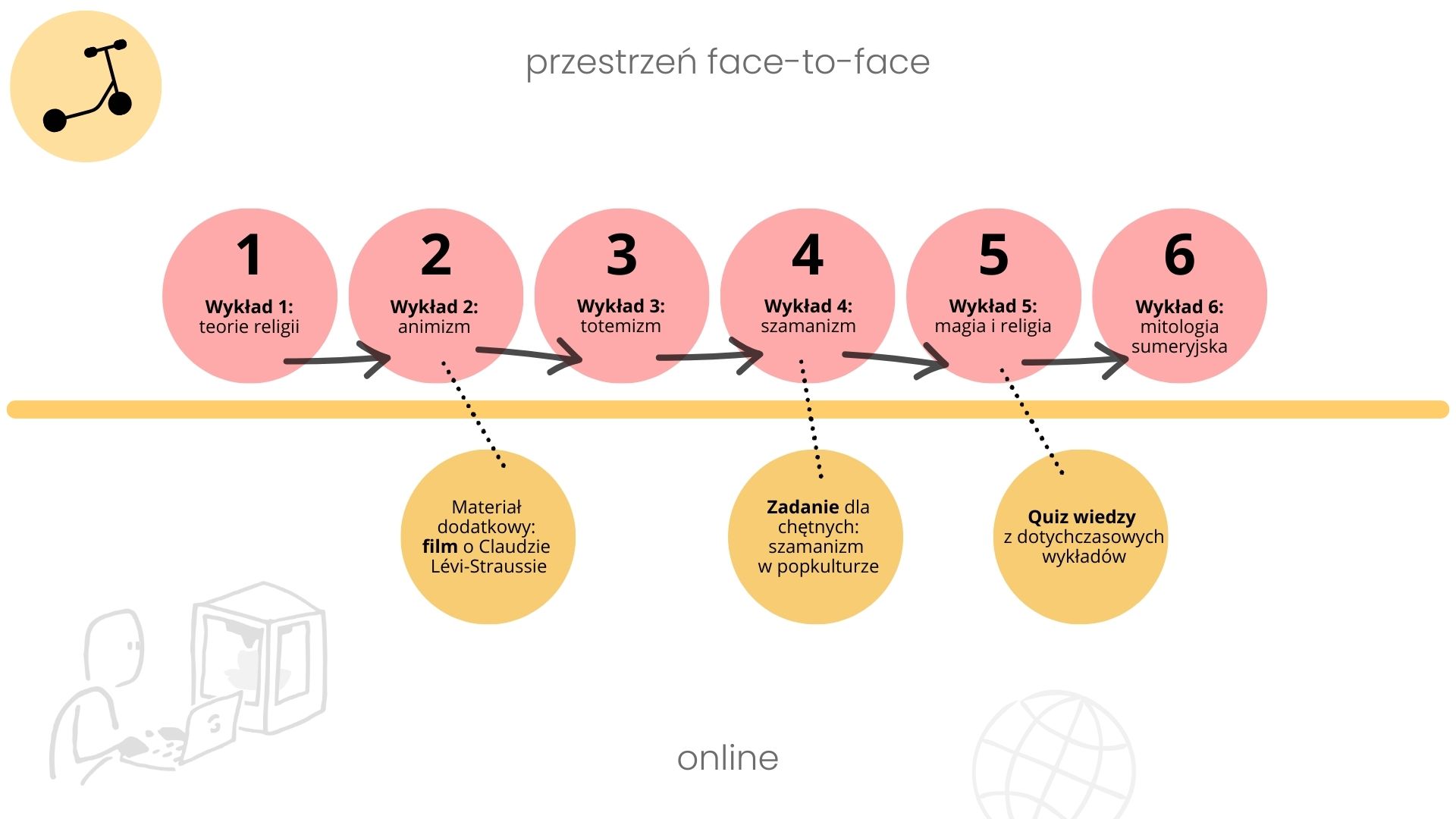 Ostatni sposób podróży to ten, kiedy jedna forma zajęć jest zdecydowanie wiodąca, a druga służy tylko jako wsparcie czy rozszerzenie (jak ta noga, która od czasu do czasu dodaje pędu hulajnodze). Najczęściej na Uczelni, wiodącą formą są zajęcia stacjonarne, a wtedy forma online może być zapleczem, gdzie: