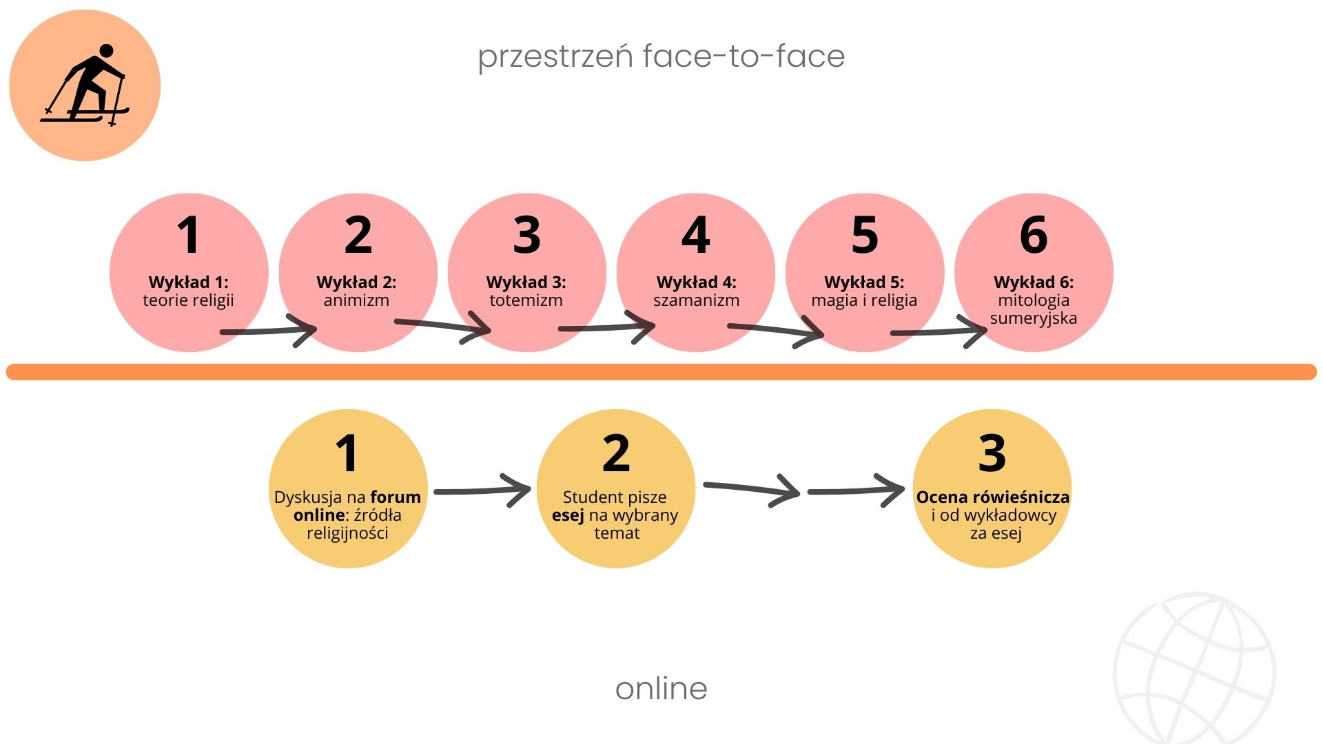 W tym podejściu mamy jedną ścieżkę kształcenia, która odbywa się linearnie, krok po kroku, czasem stacjonarnie, a czasem online. Na przykład:
