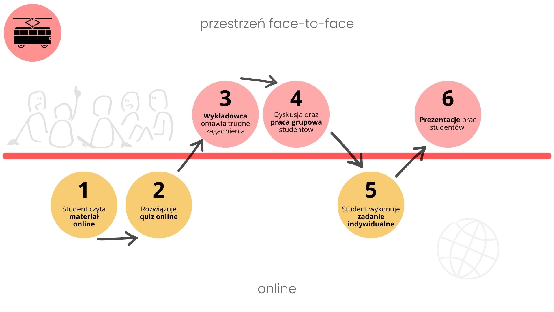 ★ Model tramwajowy, czyli jedna ścieżka nauczania, która przebiega od przystanku do przystanku, czasem stacjonarnie, a czasem online